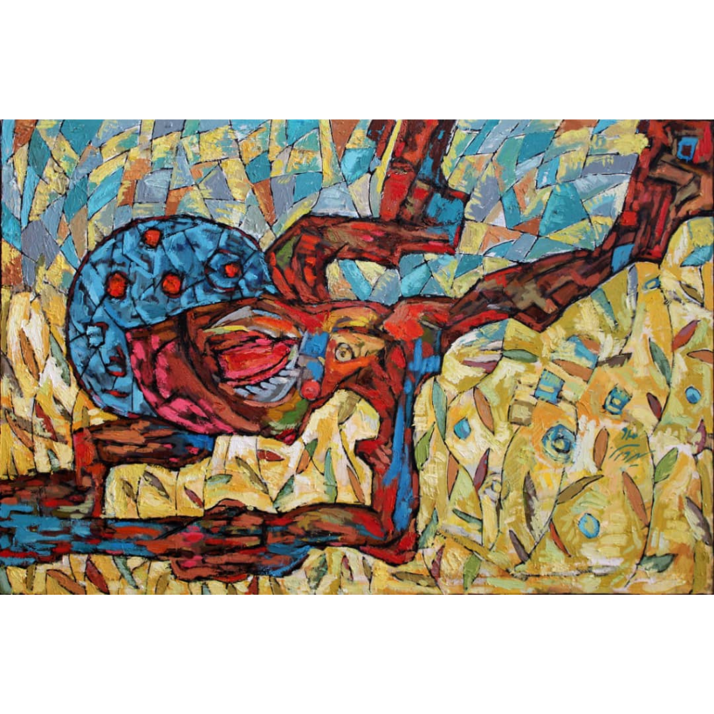Description: In The Acrobat, Sirvan Kanaani captures a surreal moment of suspension, where a contorted human form twists through fractured fields of color. The rich blue, yellow, and red mosaic frames the figure in motion, echoing balance and instability. The painting transforms a physical act into a poetic visual metaphor for vulnerability and survival through bold gestures and fractured shapes.