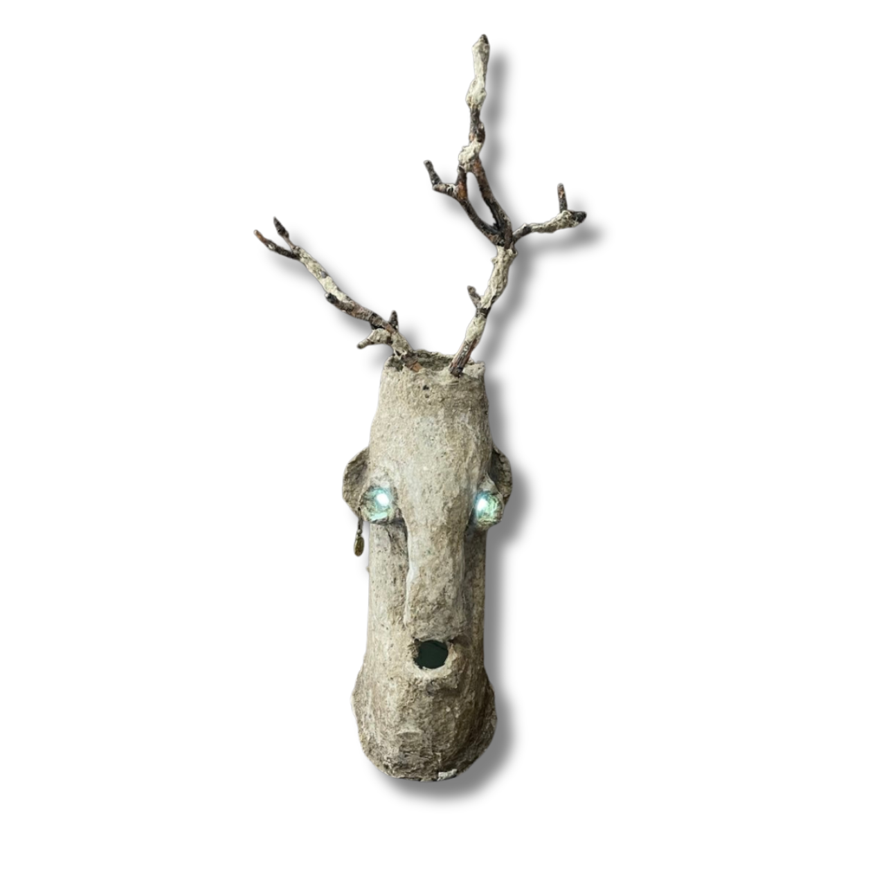 Description: The Antlered Spirit merges human presence with animal form, presenting a surreal figure crowned with natural branches. Its elongated face, hollow mouth, and glowing eyes radiate an otherworldly aura—half guardian, half apparition. Balancing fragility with strength, the sculpture suggests myth and ritual, evoking archetypes of wisdom and wilderness. The raw papier-mâché texture reinforces its primal character, while the branching antlers connect the piece to cycles of growth and renewal.