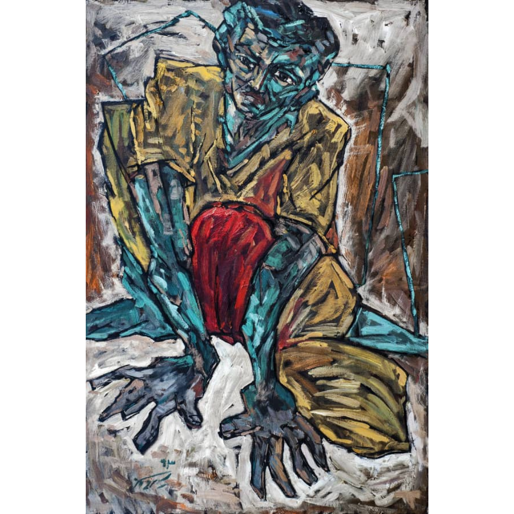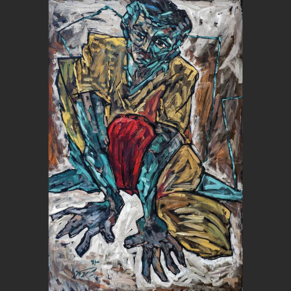 Description: In the Burdened Rest, a solitary figure sits on the ground, legs folded and palms pressed forward in a gesture of silent endurance. The viewer is drawn to the worn expression, the bent posture, and the striking contrast between the cool-toned body and a patch of vivid red, perhaps a symbol of tension, weight, or resilience. The earthy palette and layered brushwork evoke both the harshness of terrain and the quiet persistence of human labour. Sirvan Kanaani offers no straightforward narrative, only the impression of a moment heavy with unspoken stories.