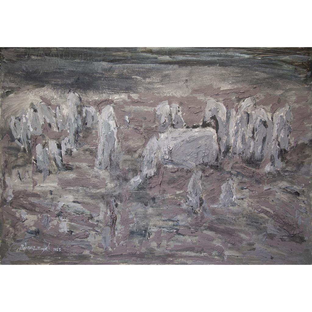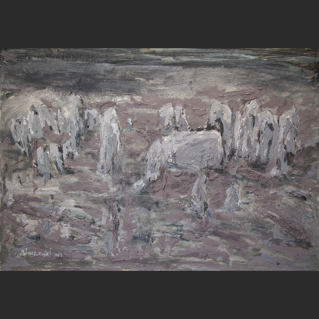 Description: In The Gathering That Time Forgot, Behrooz Majidi depicts a field of ghostly forms that feel both geological and ceremonial. Shades of lavender, Gray, and muted brown merge to create a composition that evokes a forgotten assembly — figures frozen in time, half-erased by memory. The scene is quiet, yet filled with presence, as if something sacred took place here and left only traces behind.