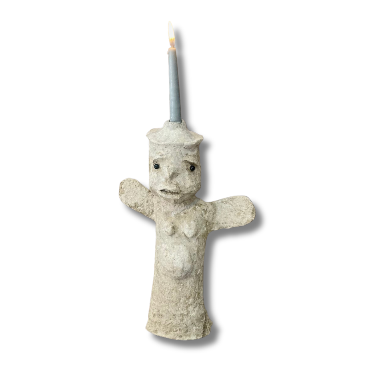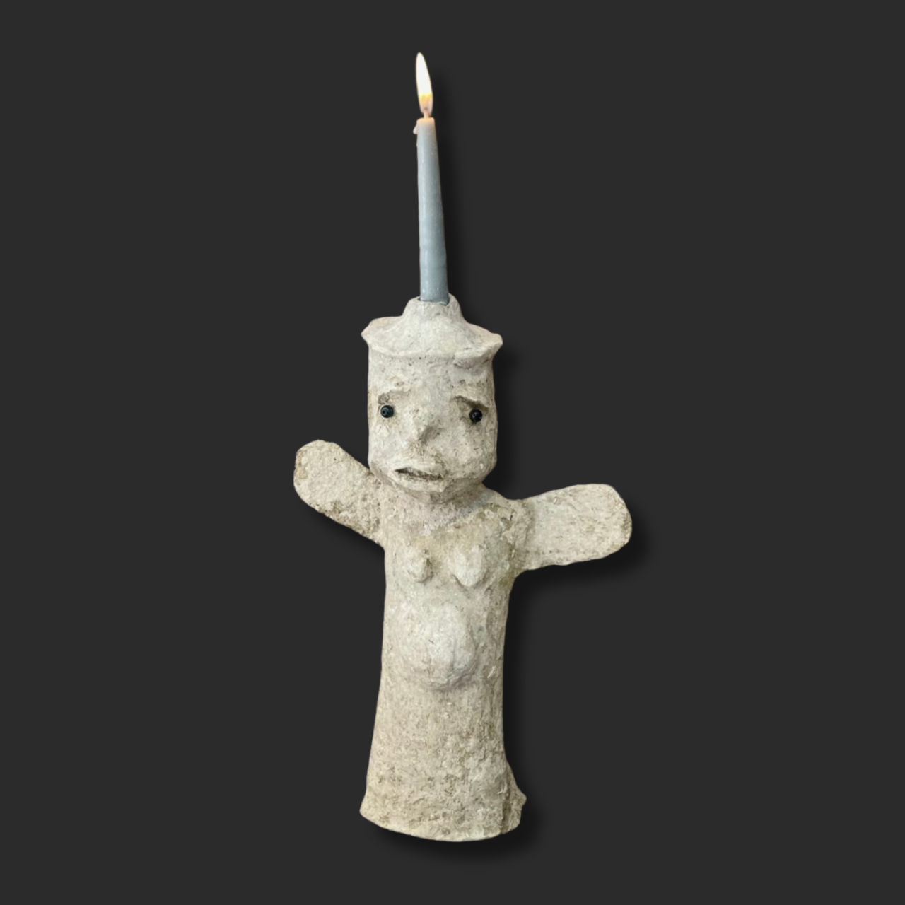 Description: The Guardian presents a standing figure with outstretched arms, embodying both fragility and strength. Designed as a candle holder, the flame resting on its head transforms the work into a ritualistic object that merges light and presence. Its raw, tactile surface contrasts with the expressive gesture of the body, evoking both protection and vulnerability.