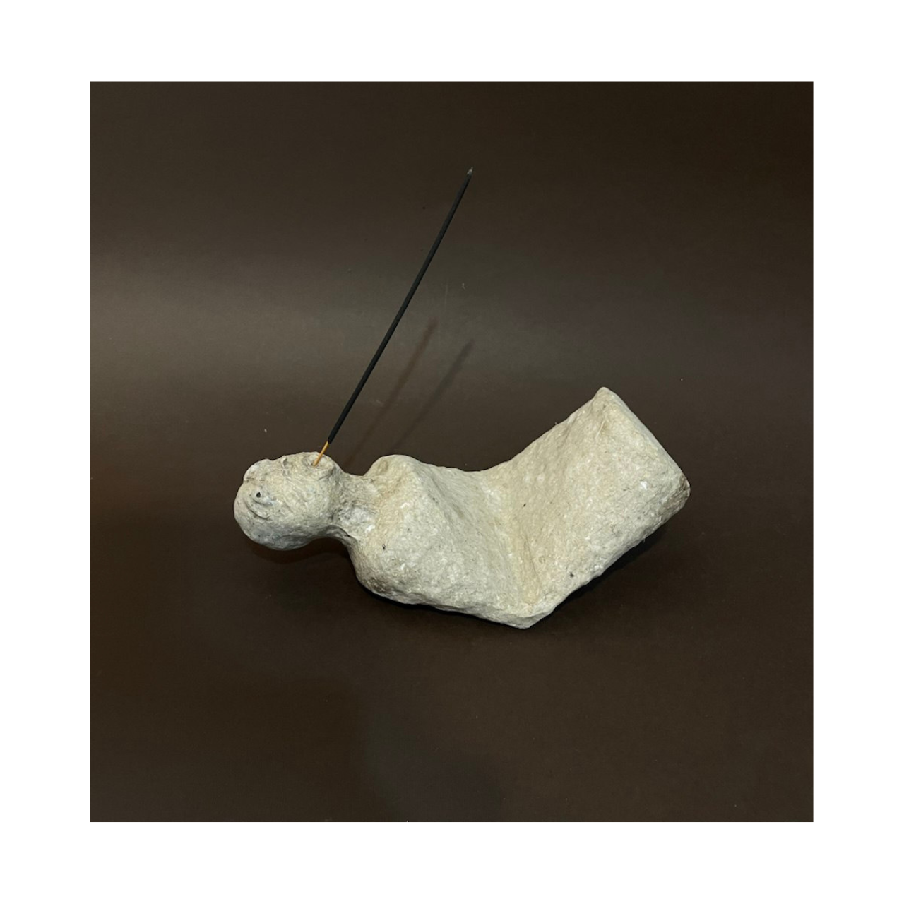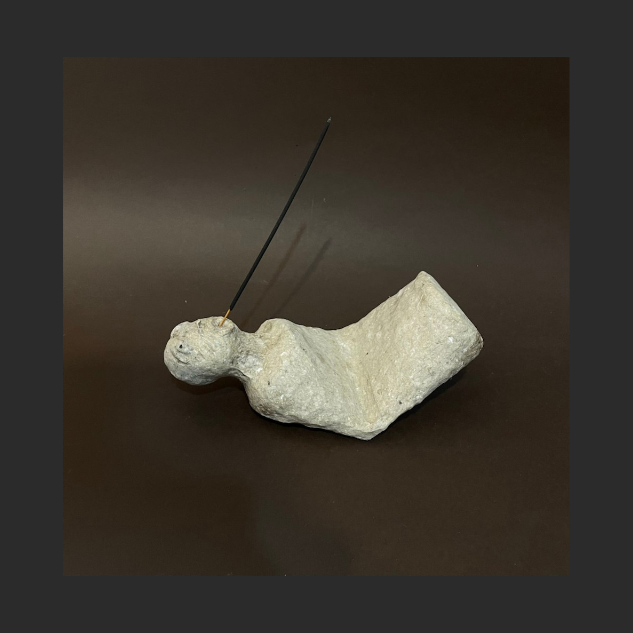 Description: The Recliner embodies stillness in form and spirit, a figure leaning gently backward as if surrendering to calm. Designed to hold incense, the piece merges utility with poetry, turning ritual into a sculptural experience. Its minimalist body, molded in raw textures of papier-mâché, suggests both fragility and permanence. With its serene presence, the sculpture becomes more than an object it is a vessel for quiet contemplation and subtle transformation.