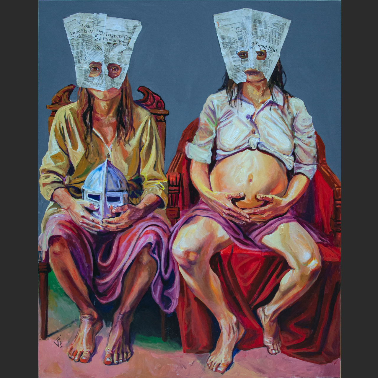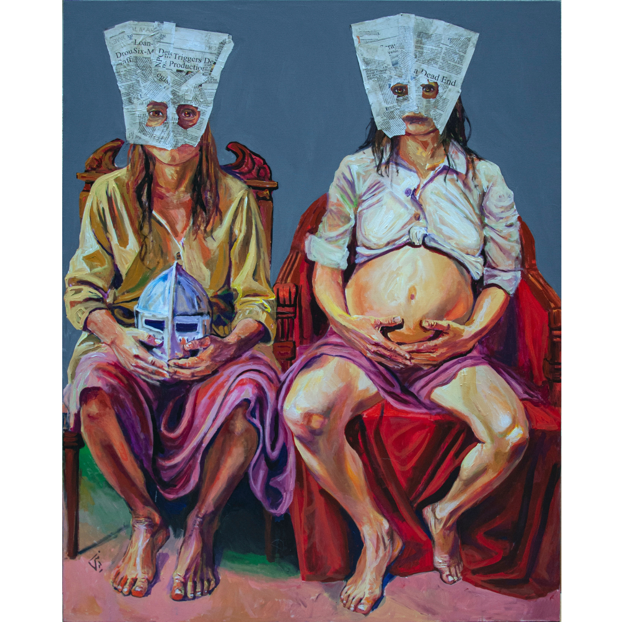 Description: In The Wheel of Time 01, Armin Ebrahimpour presents a bold visual narrative that examines identity, conformity, and the tension between individuality and societal pressure. Two seated figures wear newspaper masks, symbols of silence and media manipulation, while their postures reveal vulnerability and defiance. The contrast between the warm human tones and the cold printed text evokes the dissonance of modern existence and the cyclical nature of truth and illusion.