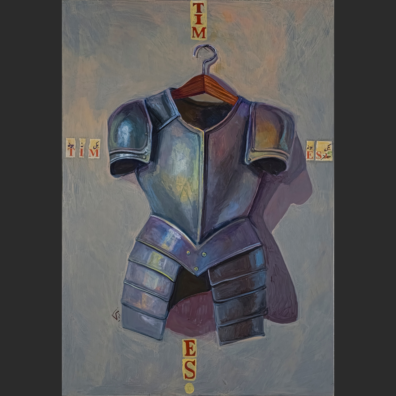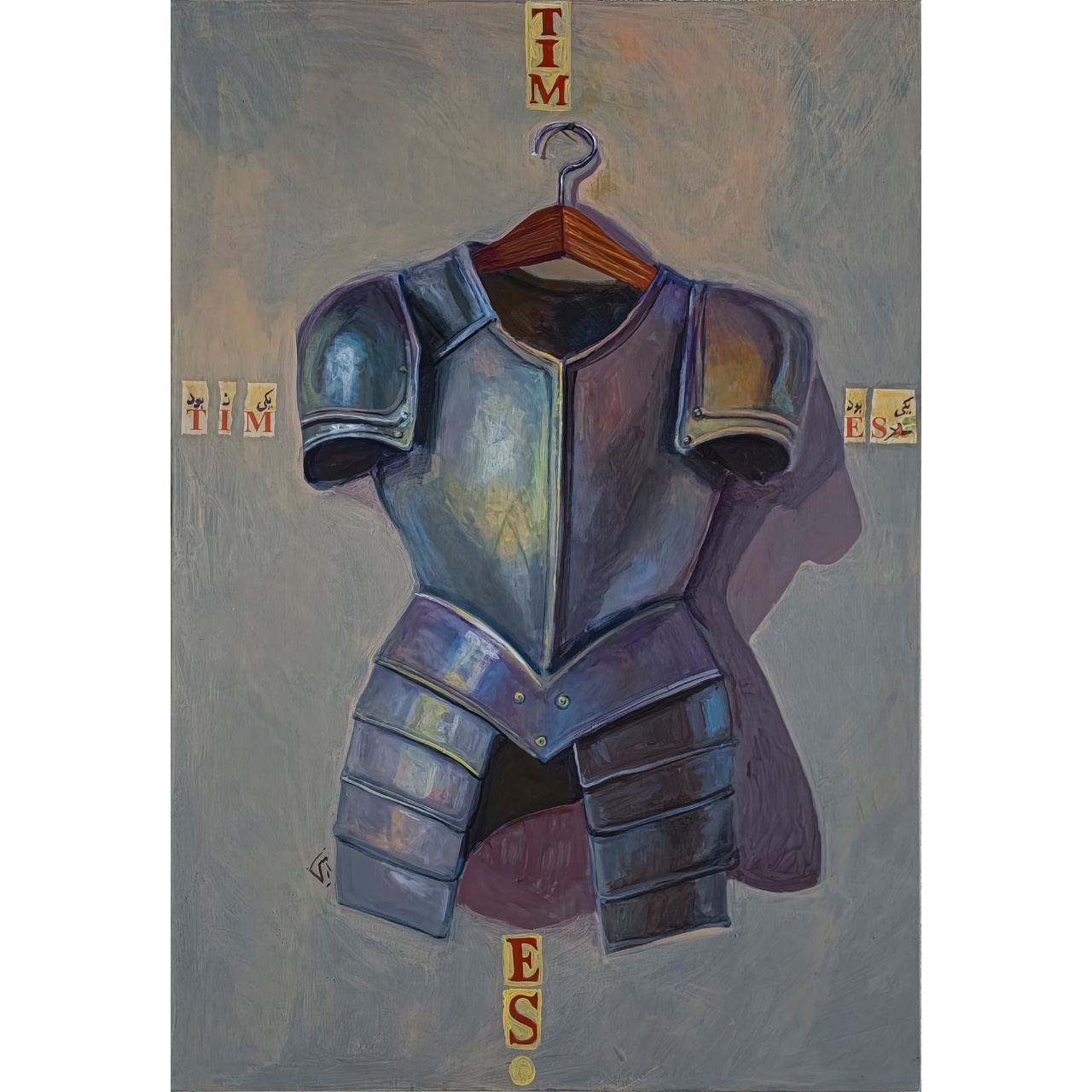 Description: In The Wheel of Time 04, Armin Ebrahimpour continues his exploration of identity, symbolism, and historical continuity. The armor suspended on a hanger becomes an artifact of memory v a body once inhabited, now left behind. Surrounded by fragmented text spelling “TIME,” the composition merges irony with reflection, alluding to the cyclical passage of power and fragility. Through layered textures and collage, Ebrahimpour transforms the concept of time into a tangible relic, simultaneously monumental and ghostly.