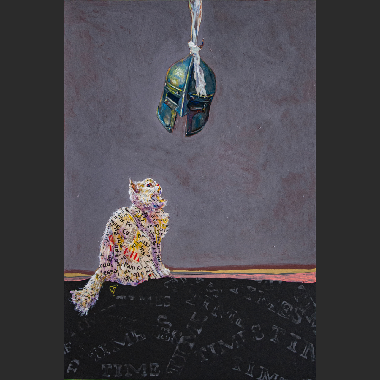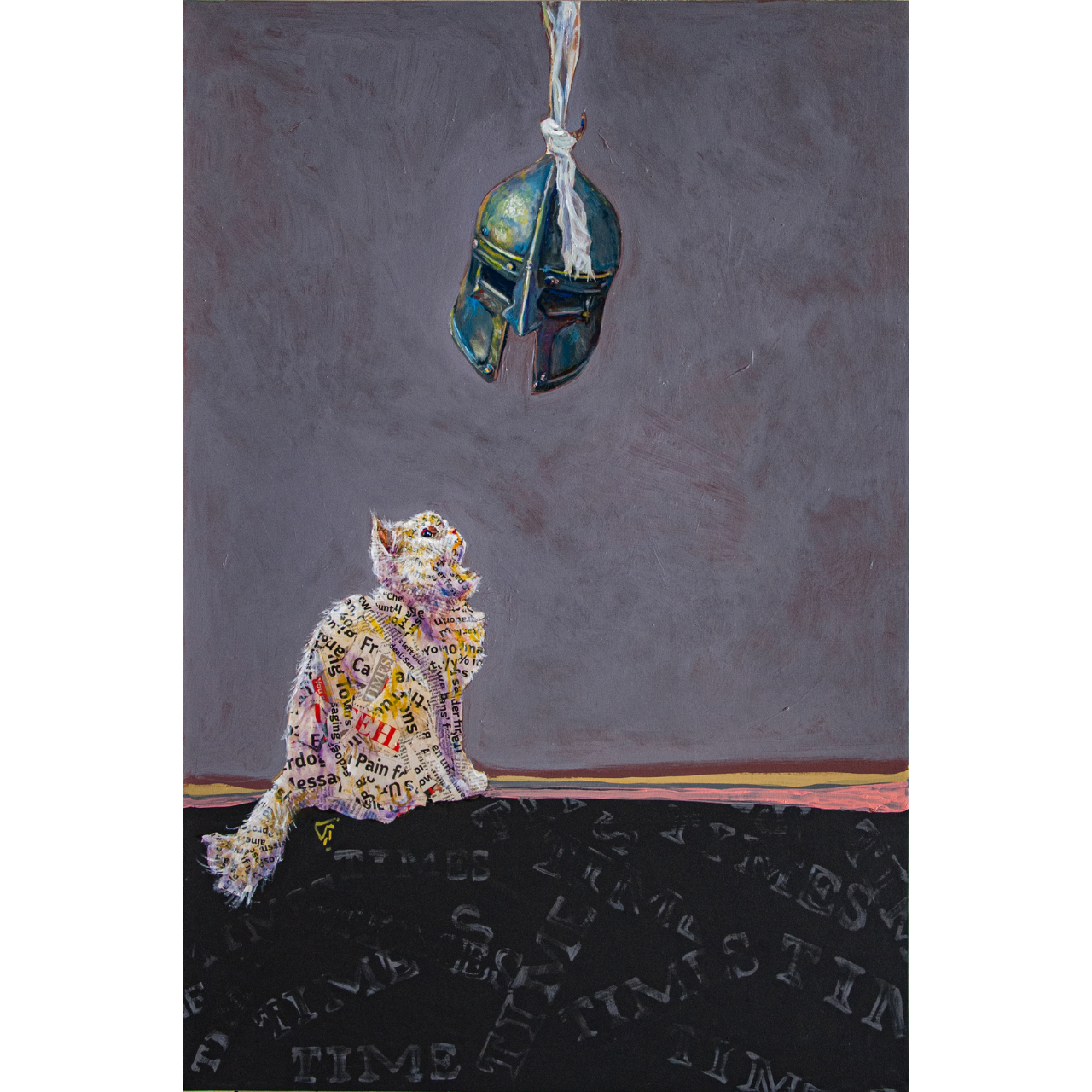 Description: In this striking piece from The Wheel of Time series, Armin Ebrahimpour creates a visual dialogue between fragility and power. A lone armor hangs suspended by a thread , its presence monumental yet hollow, suggesting the emptiness of protection when detached from its wearer. The soft, neutral background intensifies the tension between absence and endurance, while subtle newspaper fragments embedded in the surface evoke the weight of time and media on personal and historical identity.