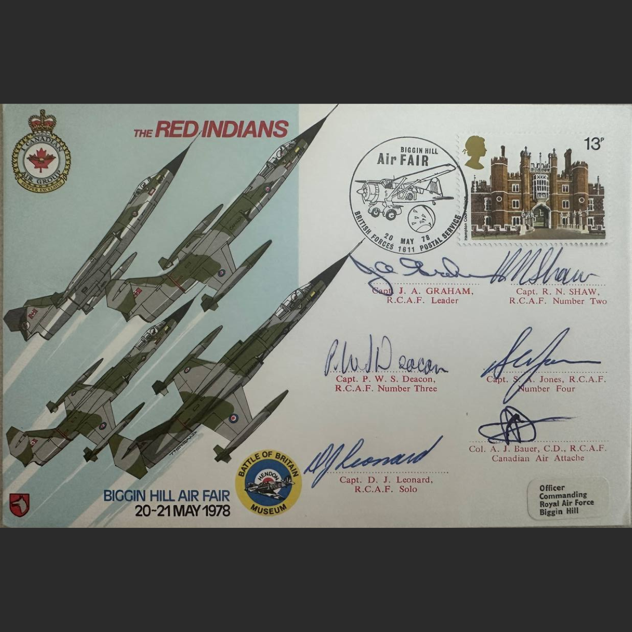 Description: This illustrated cover shows Canadian Air Force CF-104 Starfighters flying in formation, representing the RCAF Red Indians display team. The cover bears a 13p definitive stamp depicting Hampton Court Palace, postmarked with a special cancellation from the British Forces Postal Service for the Biggin Hill Air Fair on 20 May 1978.