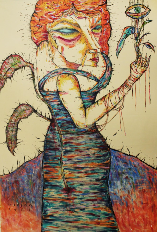 Description: A large-scale painting that challenges traditional stereotypes of women through exaggerated, monstrous figures. The work reflects on societal norms and the struggle for identity in a world dominated by consumerism and traditionalism.