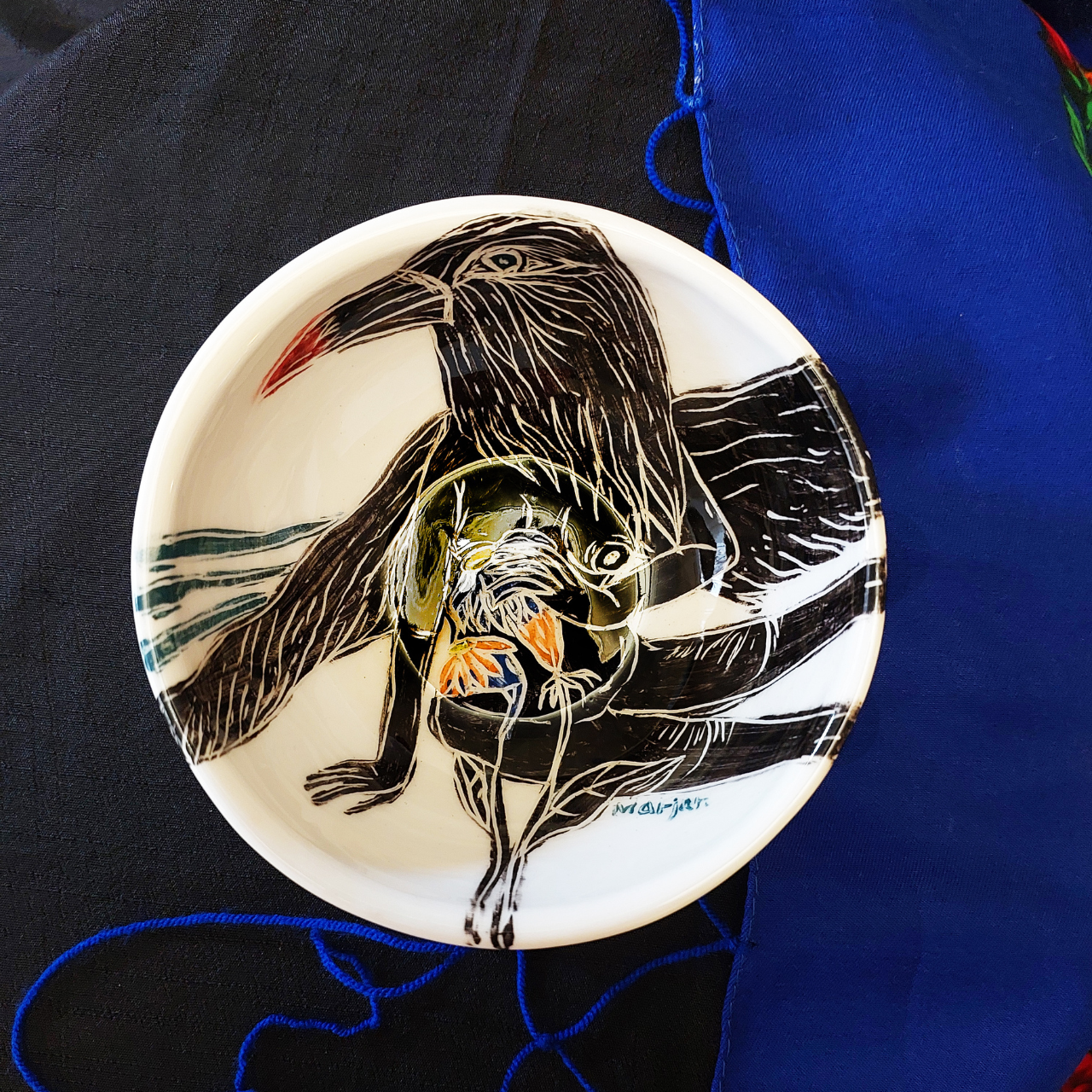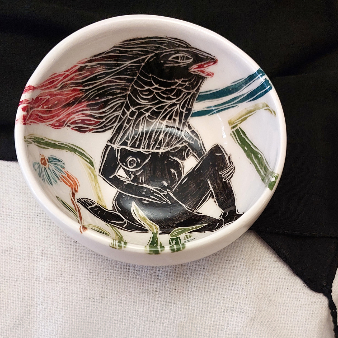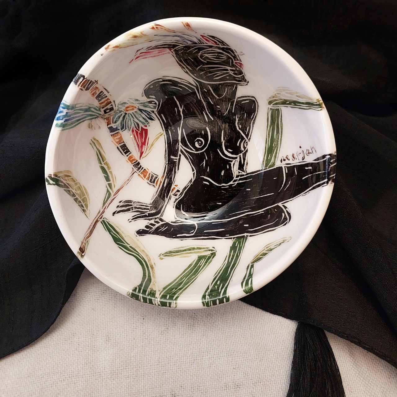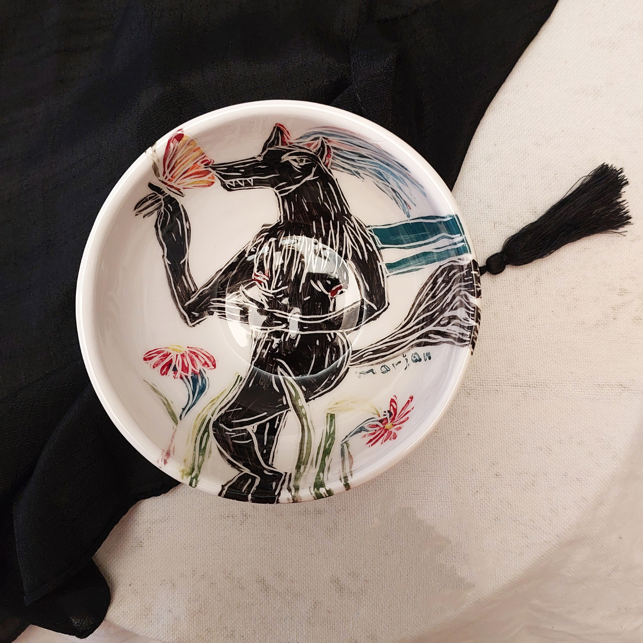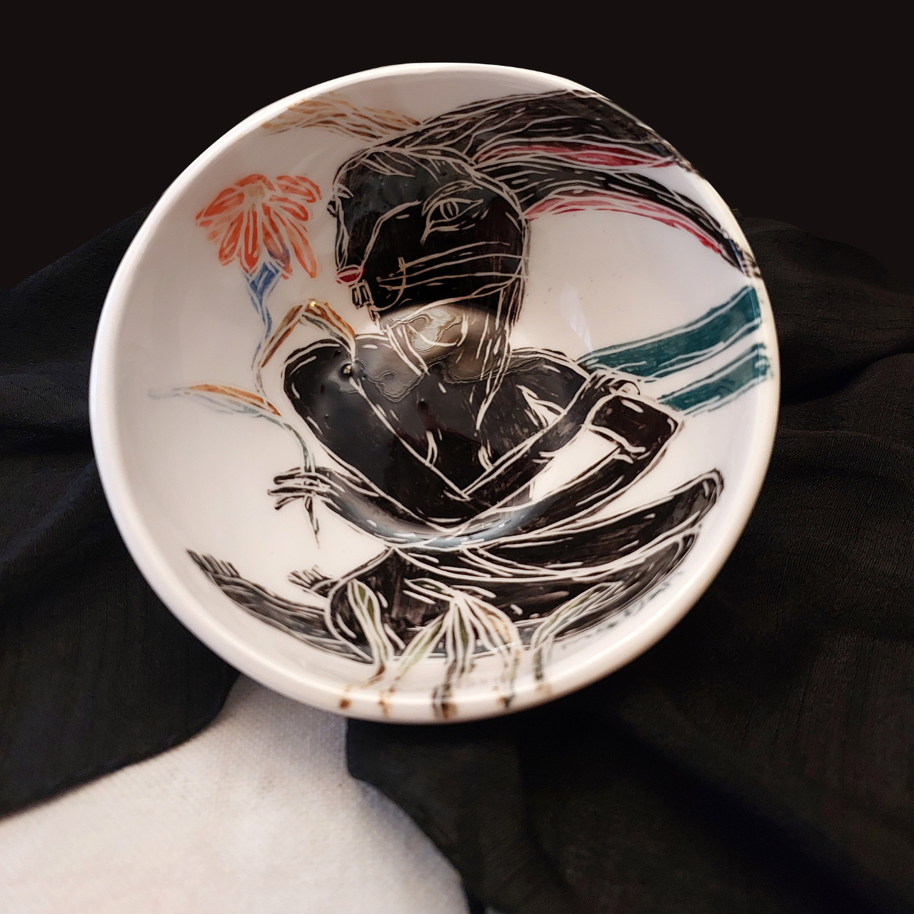 Description: This collection of six ceramic bowls by Marjan Andaroudi reimagines the feminine form through surreal and animalistic hybrids. Each piece portrays figures with transformed bodies, wolf-headed, fish-headed, or bird-headed creatures playfully merging human and animal identities. The vibrant underglaze painting introduces floral and natural motifs, emphasizing the contrast between fragility and power, beauty and monstrosity. These bowls embody Andaroudi’s ongoing exploration of identity, femininity, and the hidden layers beneath social appearances.