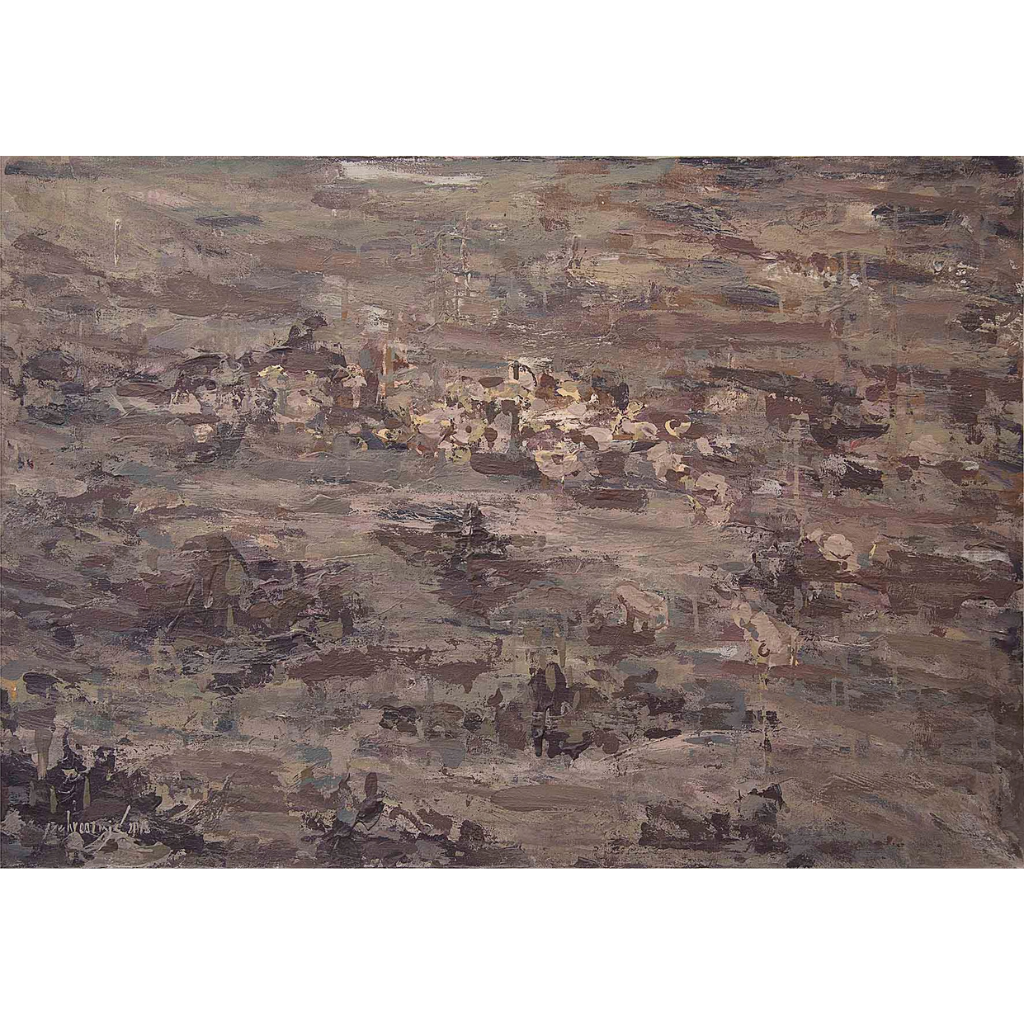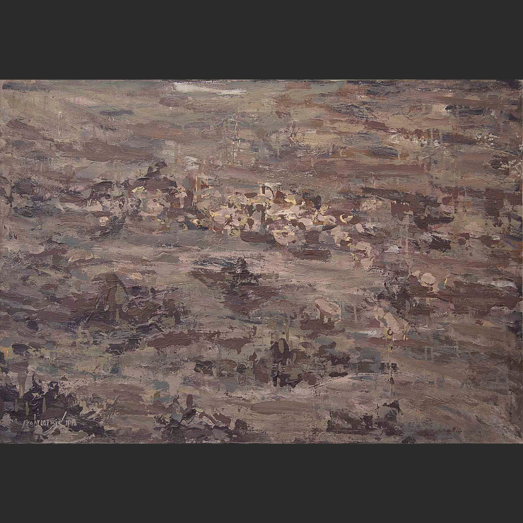 Description: In What the Earth Remembered, Behrooz Majidi paints a layered and weathered surface, where textures seem to hold traces of time. The muted tones of soil, olive, and ash swirl gently, revealing a subtle cluster of pale blossoms at the centre — a soft rupture in the sediment. The painting invites the viewer into a quiet moment where earth, memory, and life intertwine.