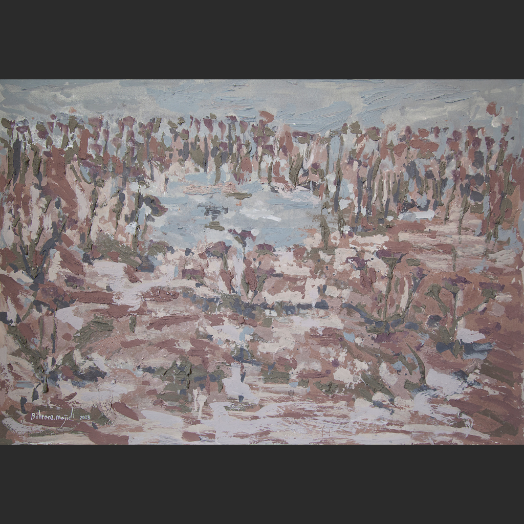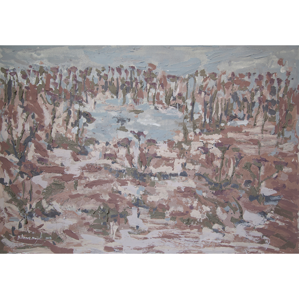 Description: In Where the Trees Remembered, Behrouz Majidi paints a landscape caught between abstraction and memory. Soft lavender and muted earth tones dominate the scene, while vertical brushstrokes suggest the presence of trees rising from a fragmented field. At the center, a faint pale-blue shape echoes the ghost of water — a lake, perhaps, that once was. The painting is meditative and quietly alive, evoking a place where nature holds onto the past, layer by layer.