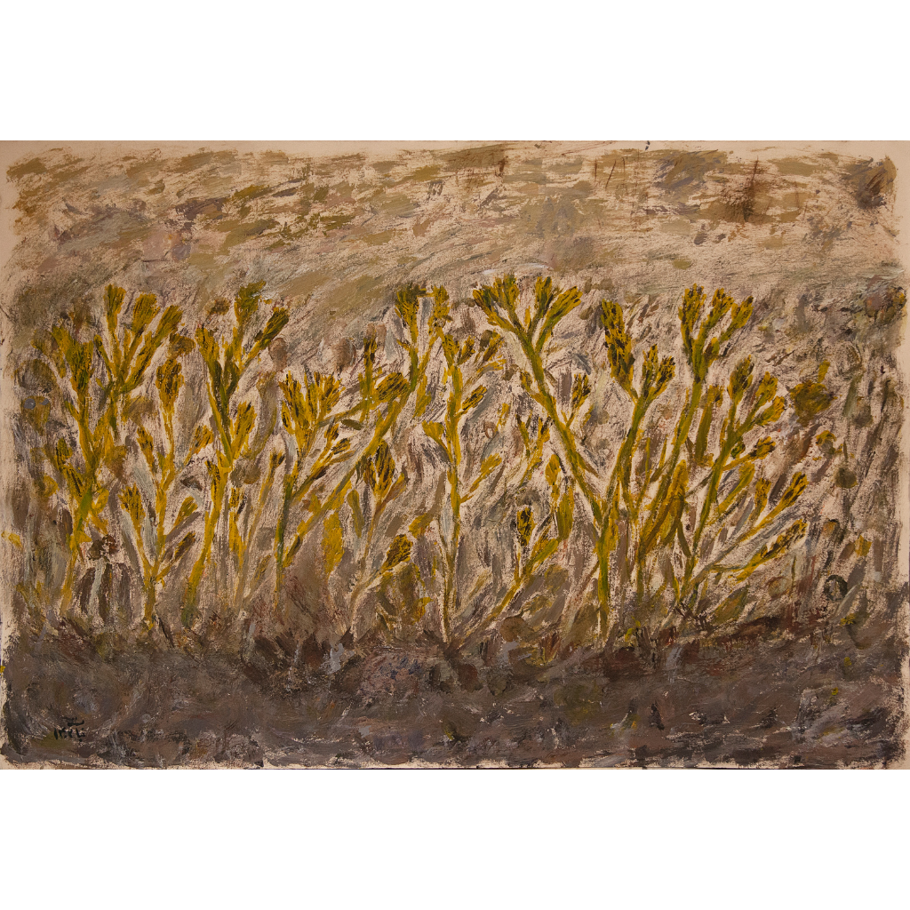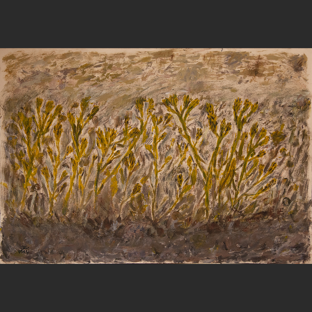 Description: In Wild Stillness, Elahe Khosravi captures the organic rise of untamed forms from the earth, blending expressive brushstrokes with textured surfaces. Using earthy yellows and browns, she evokes a field of spontaneous growth, rooted, quiet, and vital.